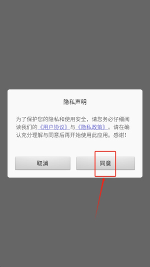 1、阅读隐私声明内容后,点击 “同意” 按钮,确认接受协议与政策,进入应用 。
