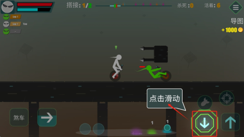 3、看到 “点击滑动” 提示,操作右侧向下箭头按钮,使火柴人驾驶载具下滑,继续闯关 。
