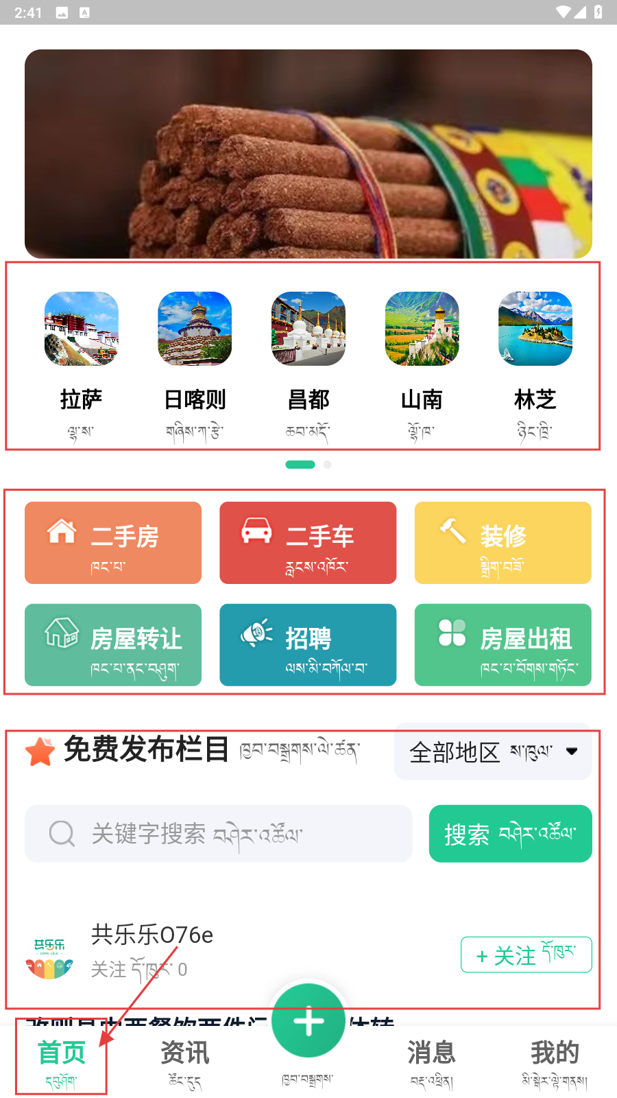 1、打开应用,在【首页】,点城市/业务图标、搜索框,进入页找信息。