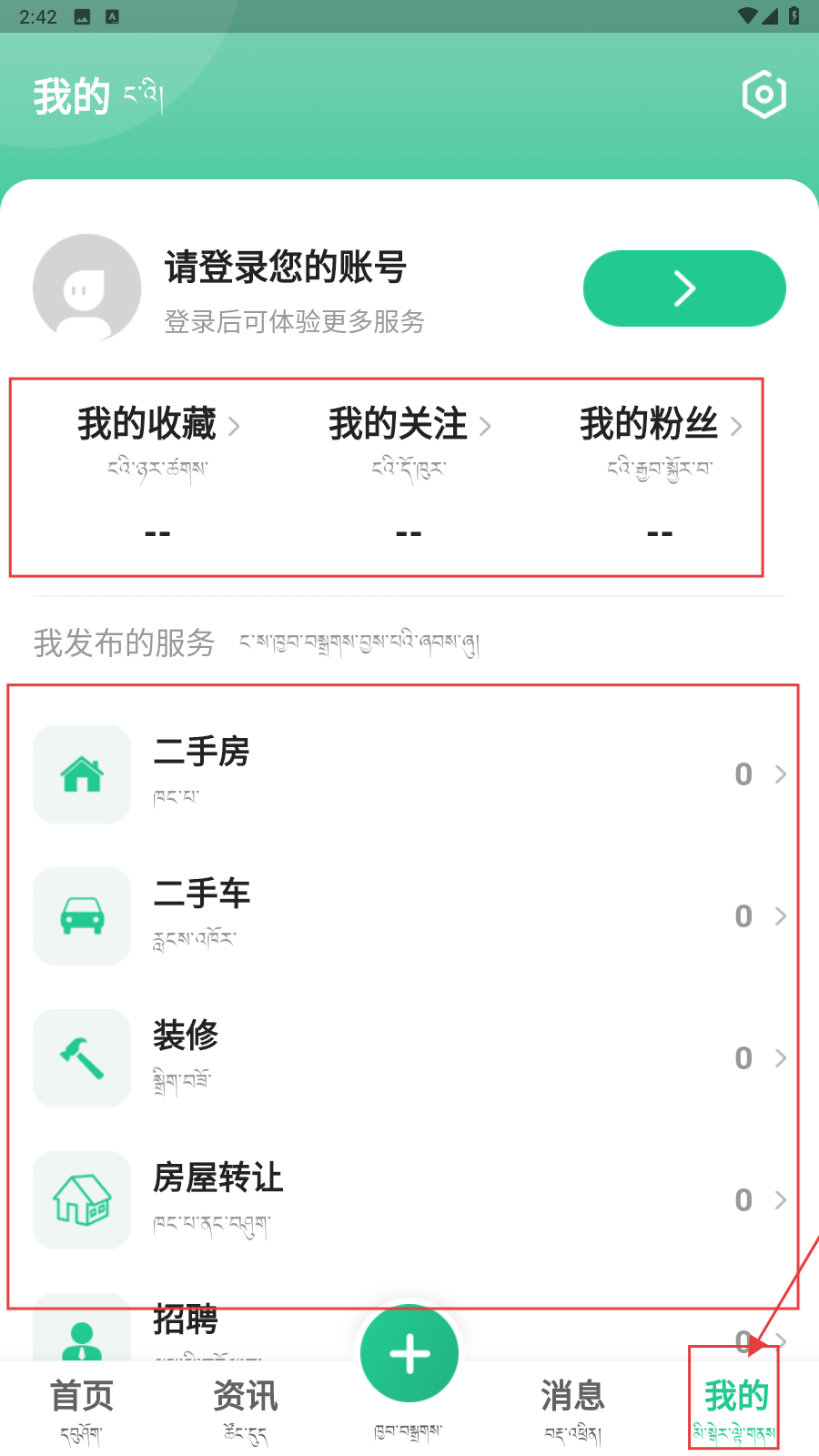 3、在【我的】,点登录区、收藏/关注等,登录或管理信息。