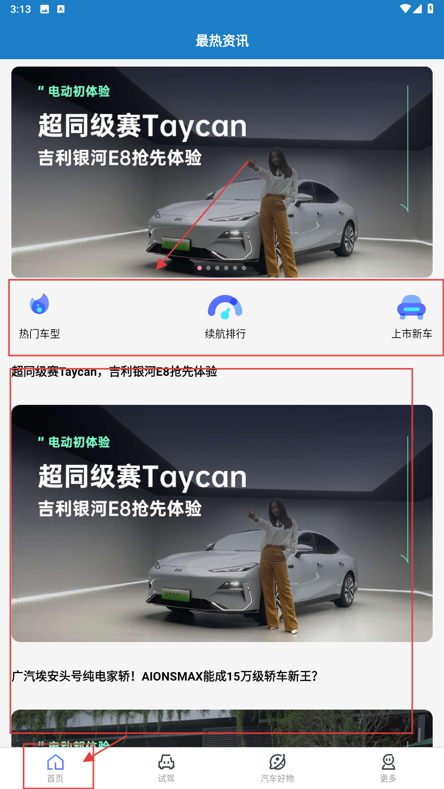 1、打开应用,在【首页】,点车型/功能图标、资讯卡片,进对应页看内容。