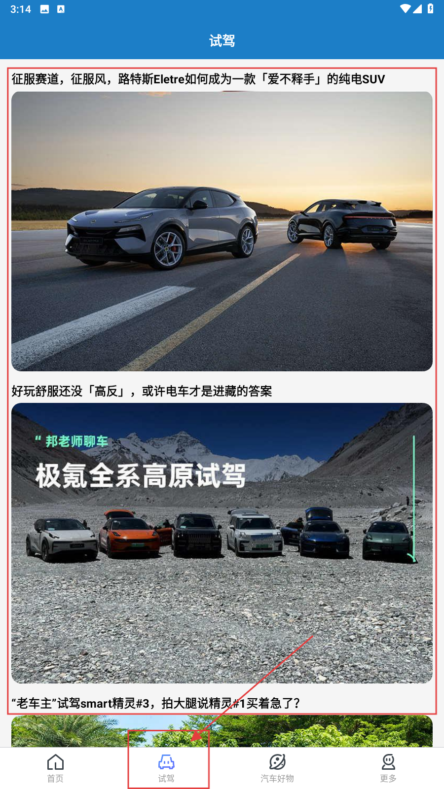 2、点底部【试驾】,进试驾资讯页,点文章条目,看详情内容。