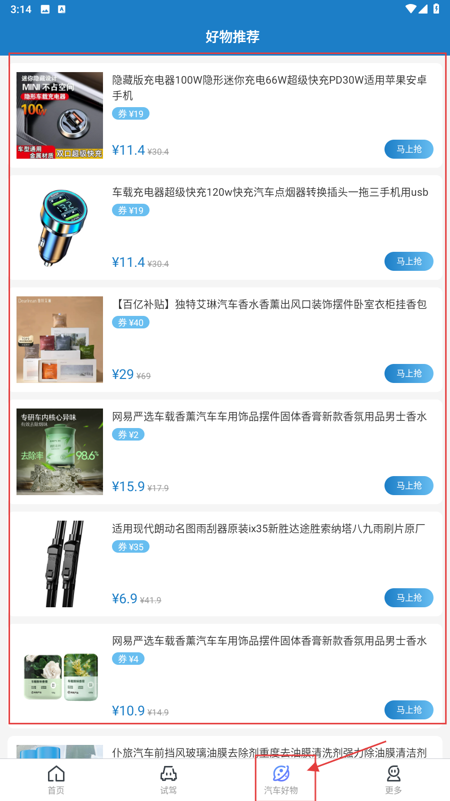 3、点底部【汽车好物】,进推荐页,点好物条目、“马上抢”,看详情或购买。