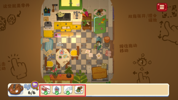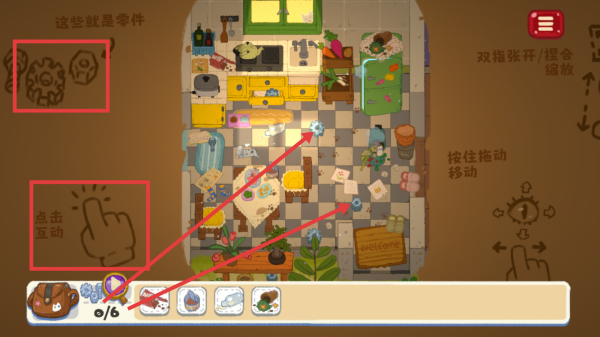 1、游戏中留意左侧提示的【这些就是零件】样式,根据【点击互动】提示,在杂乱场景中点击寻找对应零件。