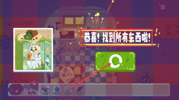 3、成功找齐所有零件出现【恭喜找到所有东西啦】提示后,及时点击绿色按钮进入下一环节。