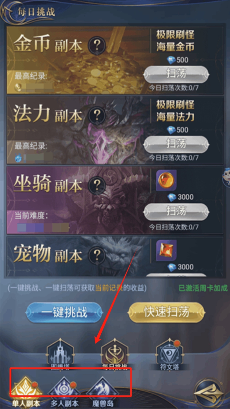 2、然后,登录后你会看到副本选择界面。在这里,你可以选择“单人副本”或“多人副本”进行挑战,开始你的冒险。
