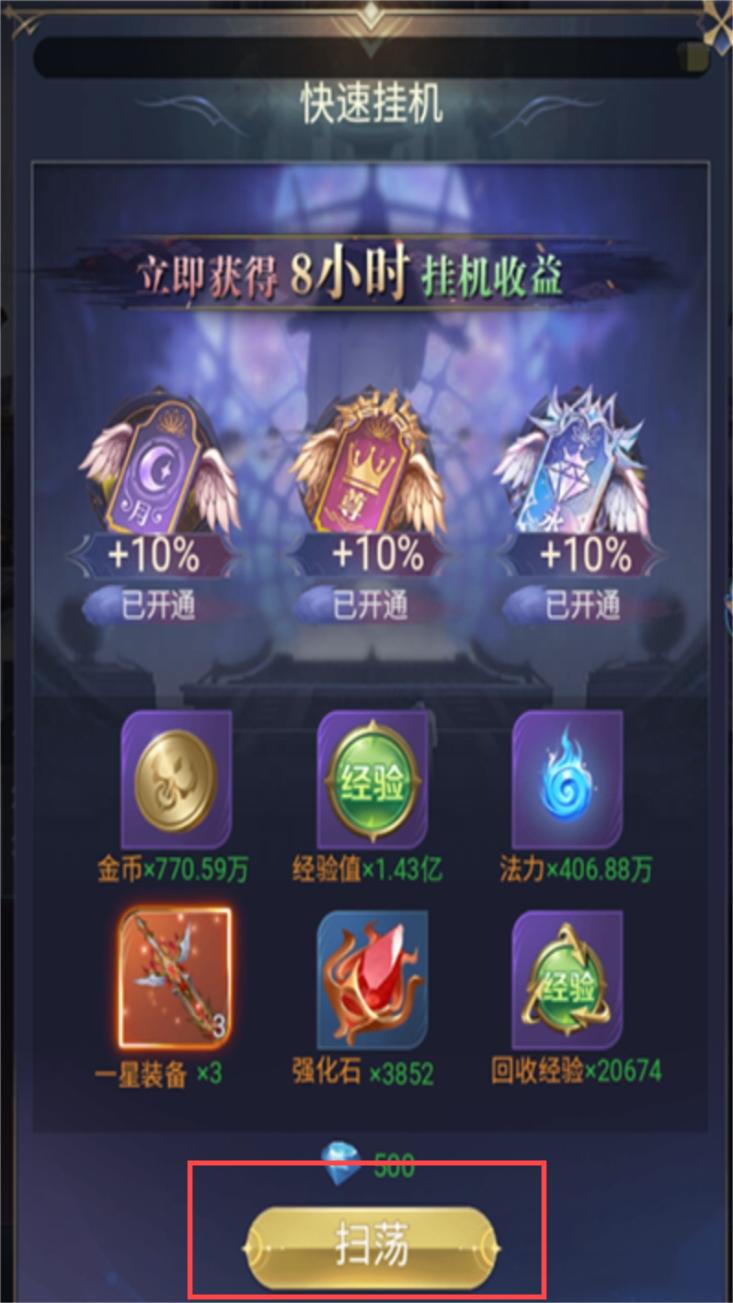 3、最后,为了加速升级,你可以使用“快速挂机”功能。点击“扫荡”按钮,消耗500钻石,立即获得8小时的挂机收益,快速提升角色等级。