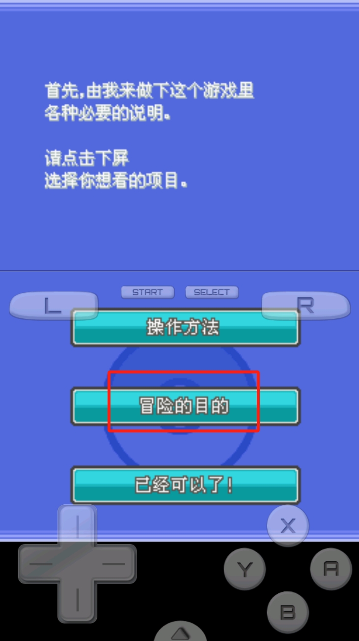 2、接着,阅读游戏说明。在游戏教程界面,使用虚拟方向键选择“冒险的目的”等选项,了解游戏玩法。
