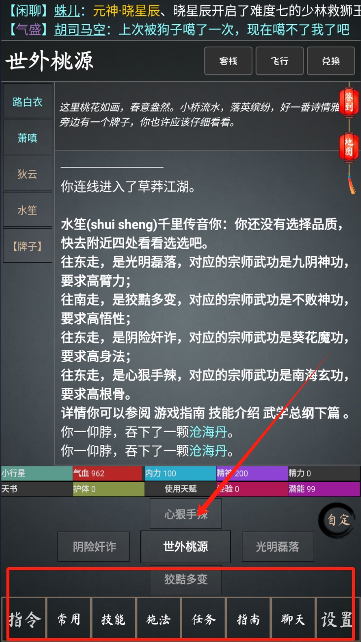 3、最后,开始你的冒险。在游戏主界面,点击“世外桃源”按钮,选择你的宗师武功,开始你的江湖之旅。