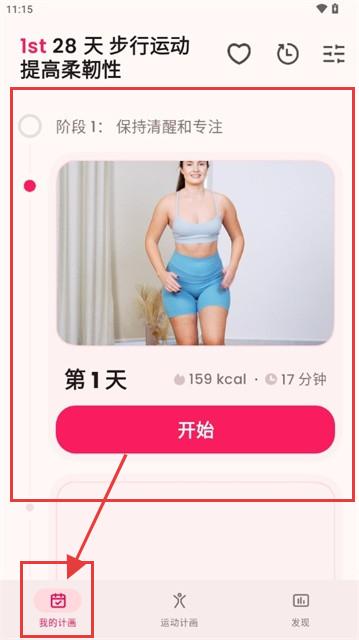 1、打开应用,在【我的计划】界面,进入运动流程。点击粉色【开始】按钮,开启“28天步行运动”第1天课程。