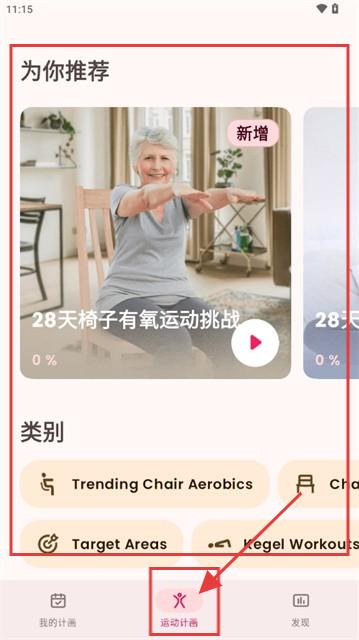 2、点击底部【运动计划】,进入推荐页。浏览“为你推荐”内容,点分类标签选运动类型。