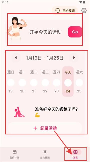 3、点击底部【发现】,进入界面。查看“开始今天的运动”模块、周计划及“纪录活动”入口,按需开启/记录运动。