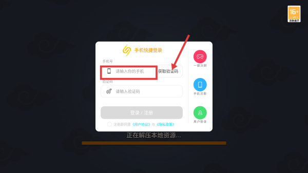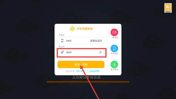 3、输入验证码,点击【登录/注册】,即可开始游戏。