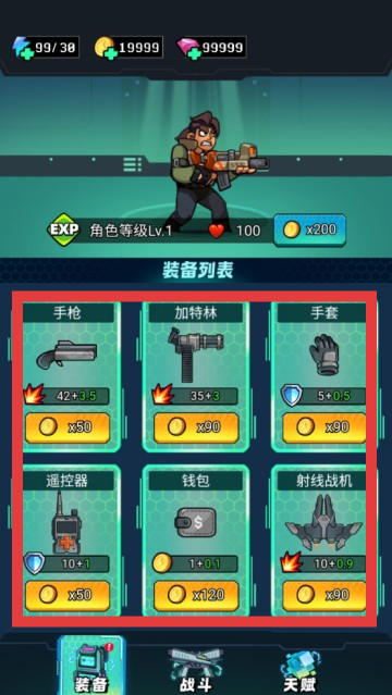 1、进入游戏后,先查看【装备列表】,根据自身金币数量,优先购买性价比高的装备,如【手枪】提升基础攻击力。