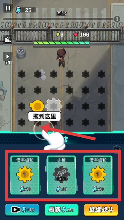 2、战斗中,留意屏幕下方道具栏,按照提示将【倍率齿轮】【手枪】等道具拖到指定位置,合理利用道具获取资源或增强战斗力。