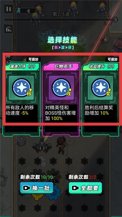 3、每波战斗结束出现【选择技能】界面时,根据当前战局和怪物类型,选择合适技能,如面对精英怪和BOSS时选【巨物杀手】增加伤害。