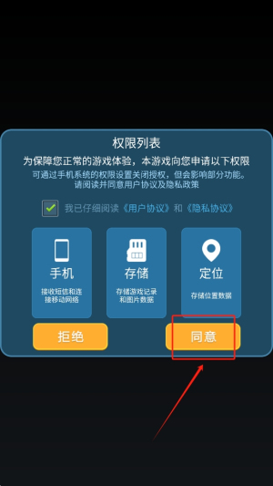 1、接受权限请求:点击“同意”按钮,以允许游戏访问必要的权限,从而开始游戏。
