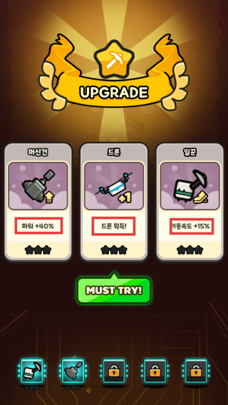 2、在【UPGRADE】界面,根据需求选择升级选项,如【파워+40%】提升功率等,增强游戏中的挖掘或战斗能力。