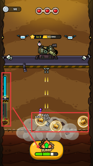 3、游戏过程中,利用【JUMP】按钮控制角色跳跃,躲避障碍物,收集如金币、道具等资源,同时留意左侧的蓝色光柱等特殊标识。