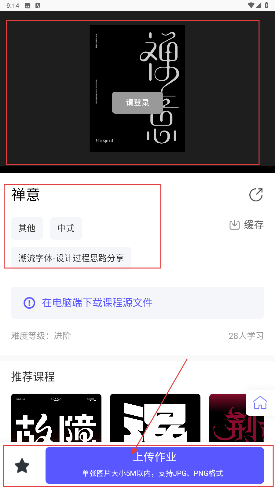 3、进入课程详情页,查看课程视频,点【上传作业】,按规传字体设计作业。
