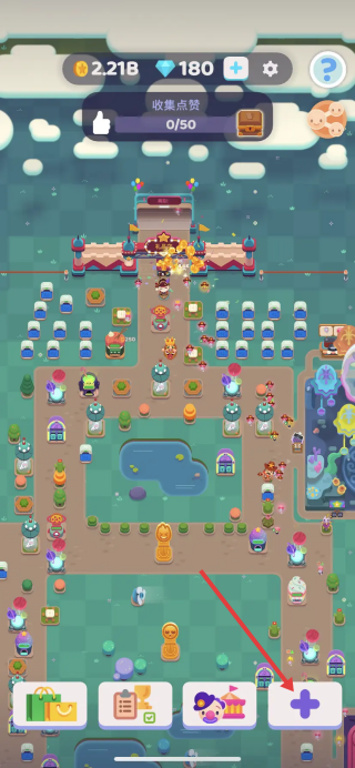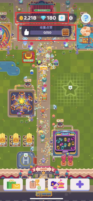 1、进入游戏后,关注屏幕上方的金币、钻石数量和【收集点赞】进度(0/50),通过完成任务和吸引游客获取资源和奖励。