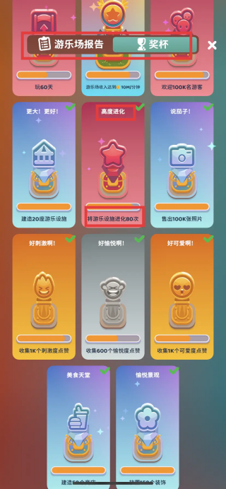 3、查看【游乐场报告】和【奖杯】界面,明确任务目标,按目标逐步推进游乐场建设,获取奖杯和奖励,提升游乐场规模和收益。