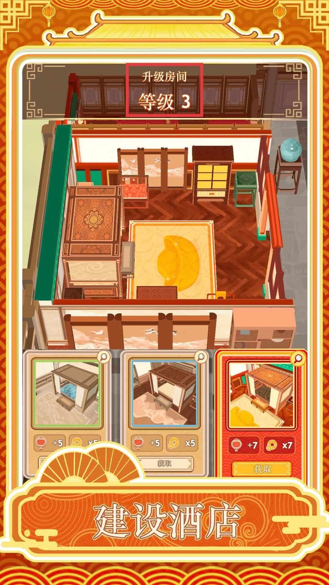 1、在【建设酒店】方面,关注房间等级,通过选择不同家具升级房间,提升酒店品质和收益。