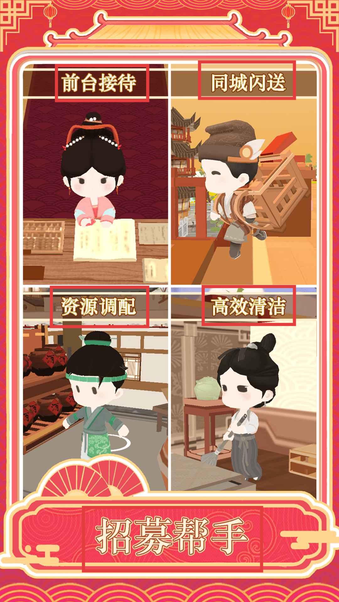 2、助手雇佣功能:逐步解锁清洁工和跑腿帮手等协助角色,有效分担日常重复性任务操作内容。