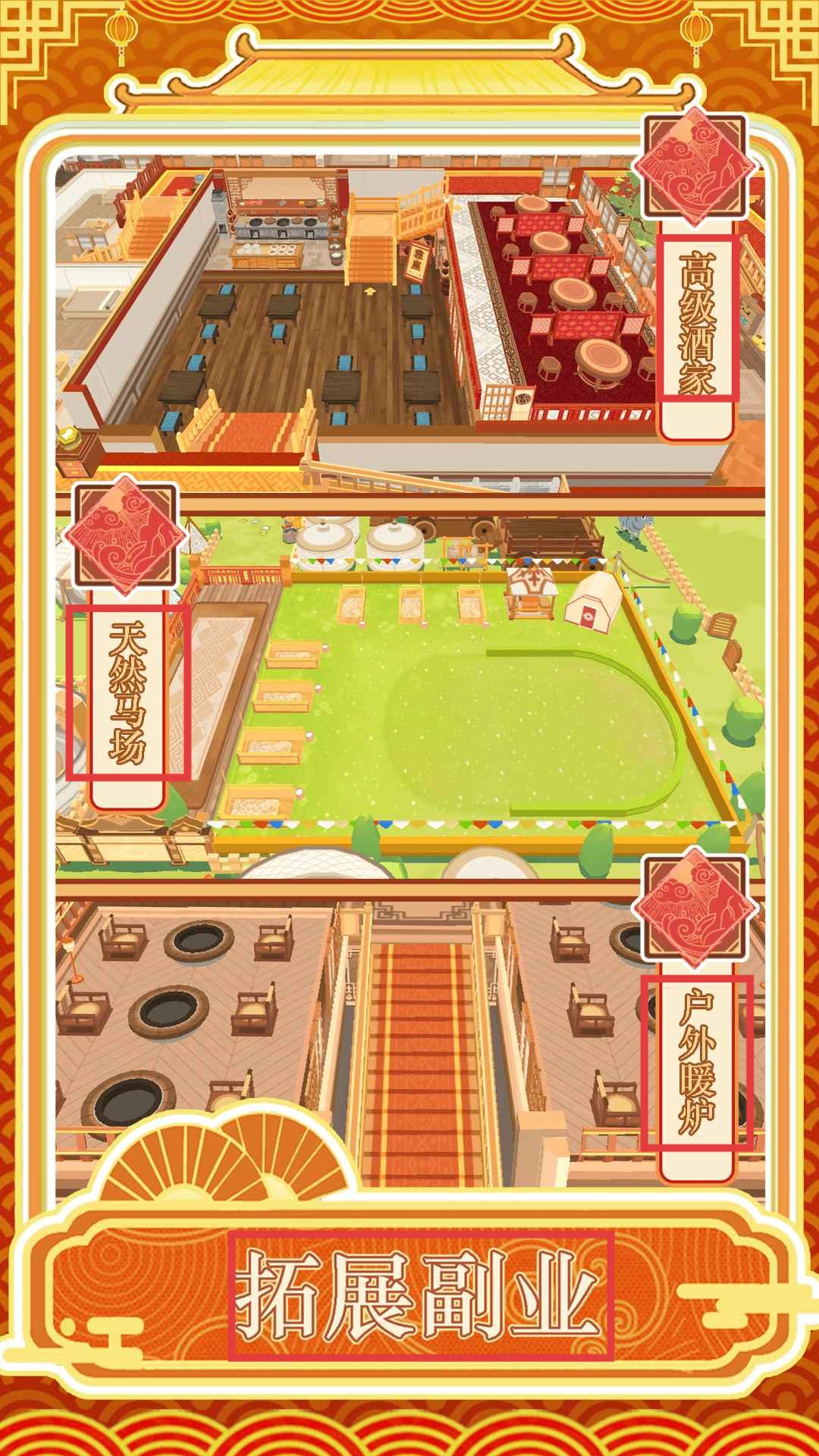 3、通过【拓展副业】,建设高级酒家、天然马场、户外暖炉等设施,丰富酒店业务类型,吸引更多客人,增加整体收入。