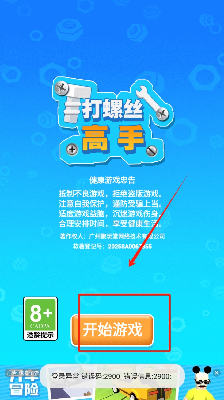 1、首先,打开打螺丝高手软件,阅读健康游戏忠告后,点击“开始游戏”按钮进入游戏主界面。