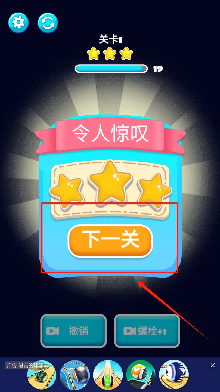 3、最后,完成关卡后,会显示你的得分和评价。点击“下一关”按钮,继续挑战下一个关卡,或者点击“撤销”按钮重新挑战当前关卡。