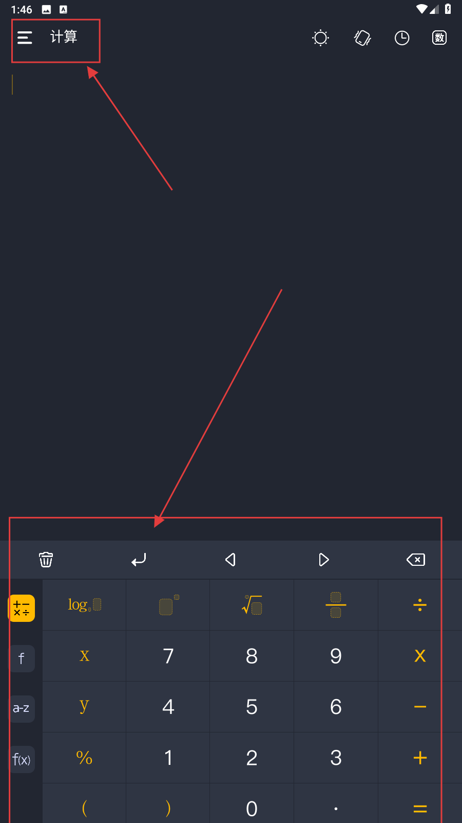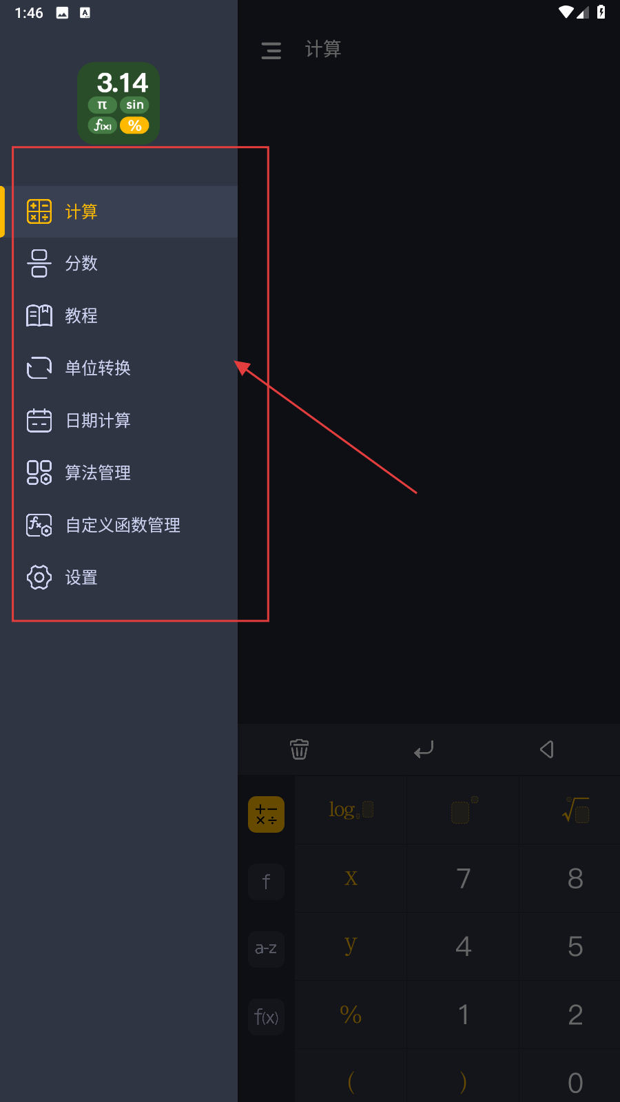 1、打开应用,在【计算】主界面可以进行基础的计算,点击左上角三个杠图标,展开侧边栏。