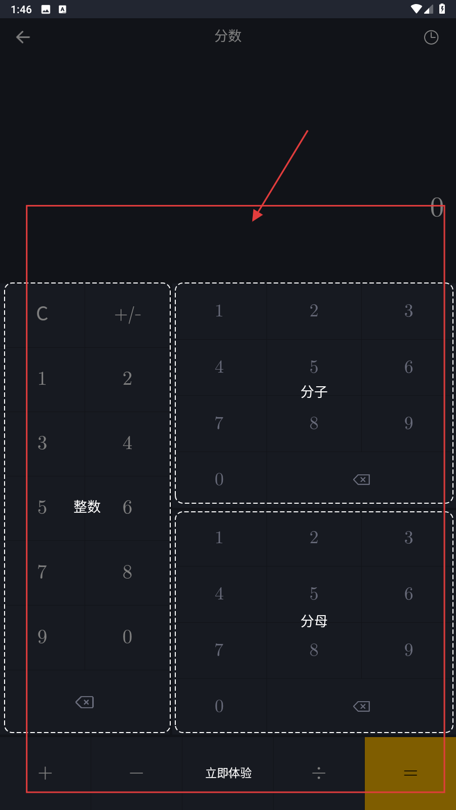 3、在分数计算界面,通过“整数”“分子”“分母”区域按键,输入对应数值,点击【立即体验】即可计算。