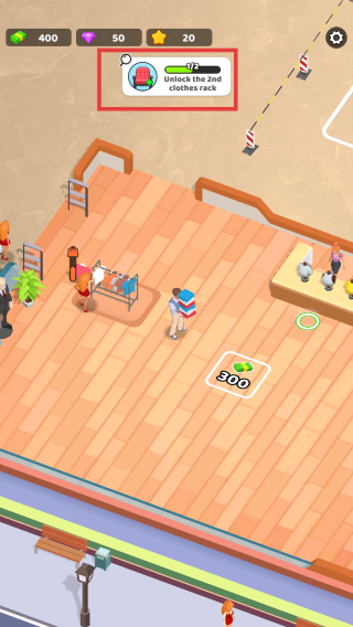 3、留意任务提示(如“Unlockthe2ndclothesrack”,进度1/2),按要求完成任务解锁新设施,丰富店铺功能,提升游戏进程和收益。
