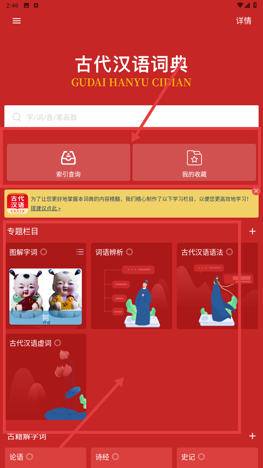 2、专题栏目学习:涵盖图解词汇、字词辨析、虚词学习、语法讲解四大板块,深度解析古汉语字词文化,提升学习深度。