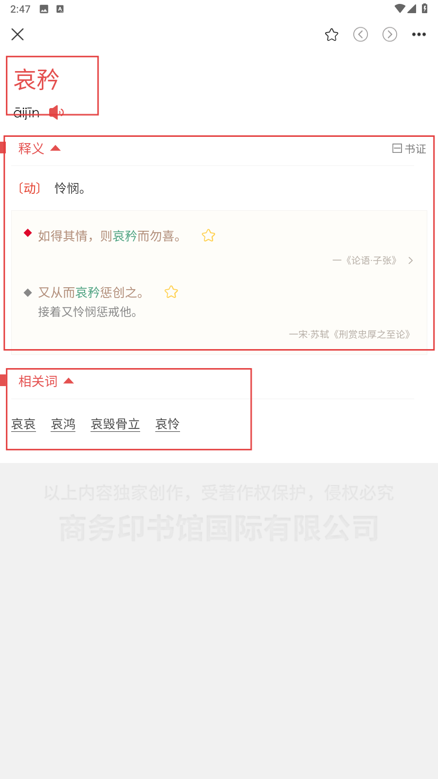 3、点击字词,查看释义、书证、相关词,即可进行古代汉语字词查询。