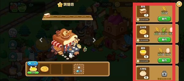 3、在烘焙坊等加工场所,根据已有食材(如小麦、鸡蛋等)和配方,点击【制作】按钮生产食品,通过加工提升资源价值,推动游戏发展。