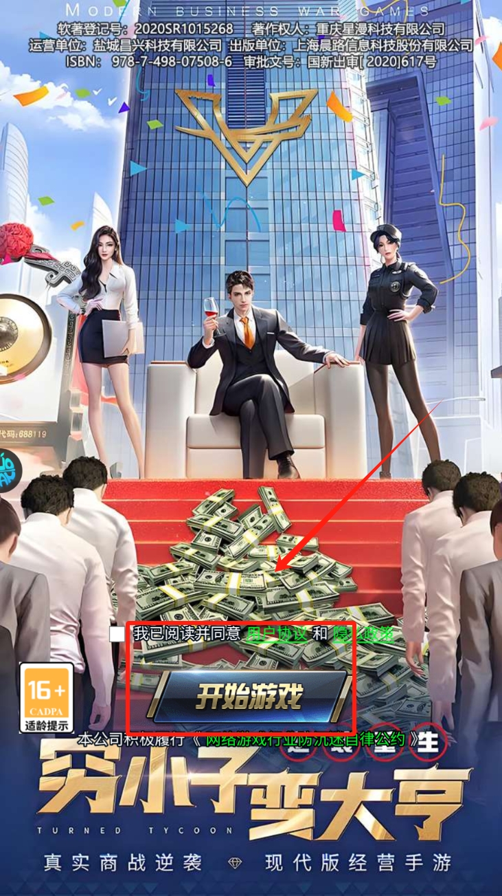 1、点击“开始游戏”进入游戏。在游戏启动界面,阅读并同意用户协议后,点击“开始游戏”按钮以进入游戏。