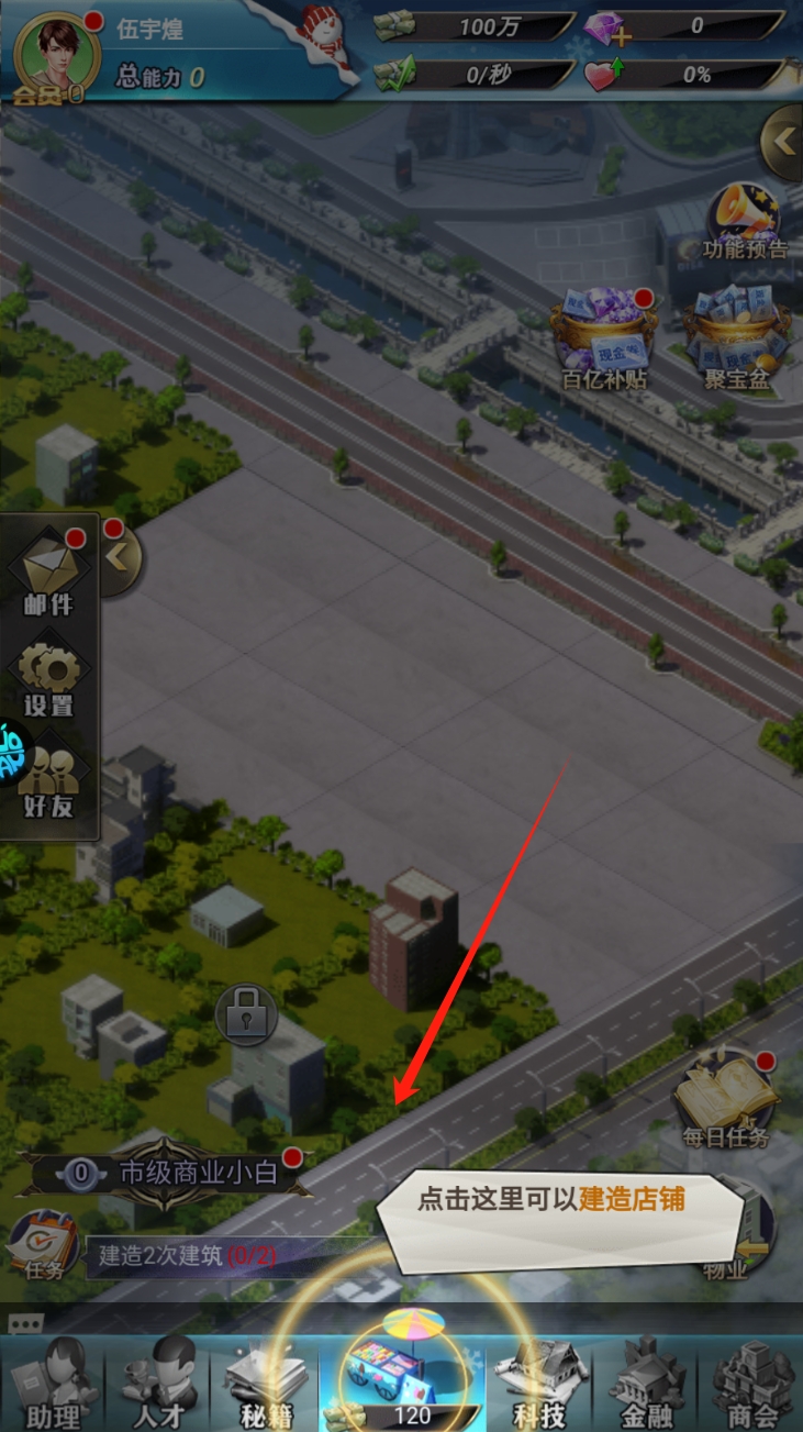 2、点击地图上的空白区域建造店铺。进入游戏后,根据提示点击地图上的空白区域,选择建造店铺以开始您的商业帝国。