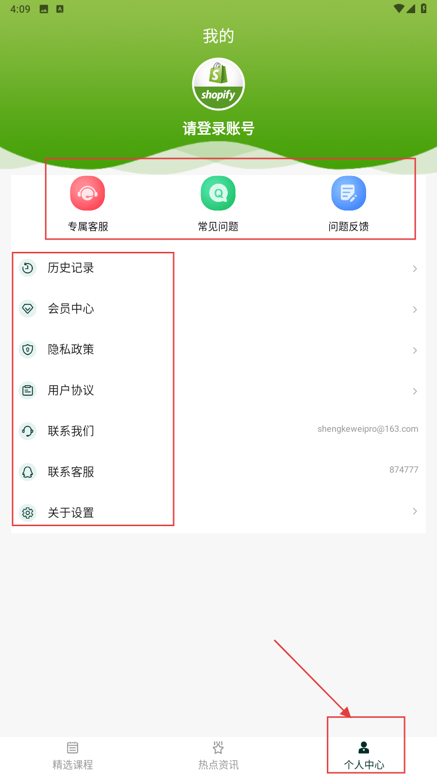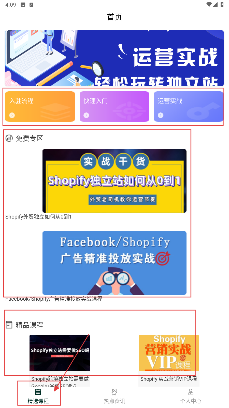 1、打开应用,在【精选课程】页,选入驻流程、免费课程(如Shopify独立站)学习。