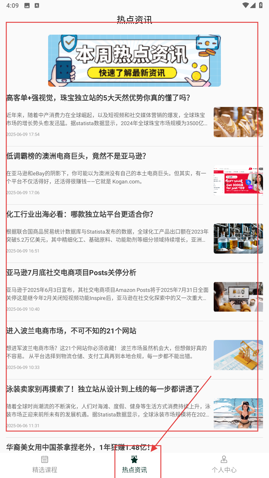2、切换到【热点资讯】页,浏览电商行业资讯(如珠宝独立站、澳洲电商),了解行业动态。