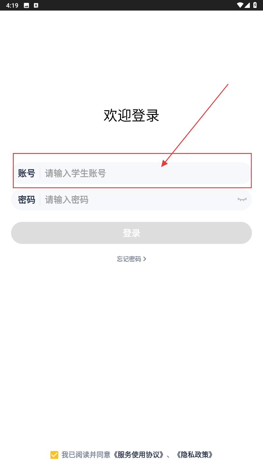 1、打开登录页面,在【账号】框输入学生账号。