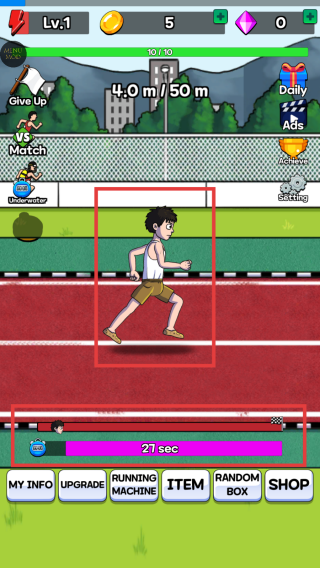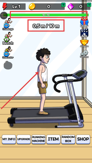 1、游戏初始,在跑步机场景中,关注屏幕上方的进度条,通过点击相关按钮让角色在跑步机上运动,积累跑步距离,提升等级(Lv.1)。