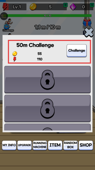 2、点击【Challange】按钮参与挑战(如50mchallenge),获取奖励(如55金币、110经验值),解锁新的游戏内容和功能。