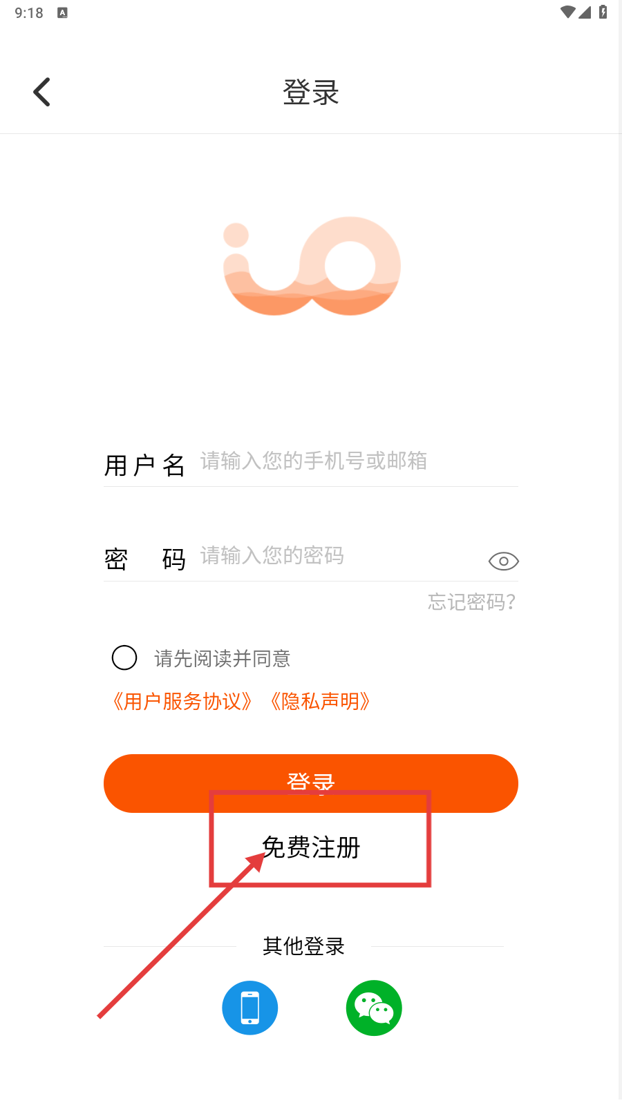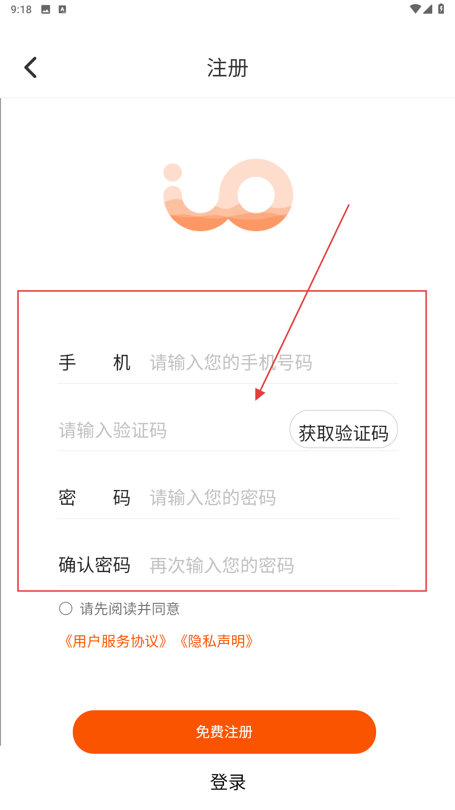 1、打开应用登录页,点击【免费注册】,进入注册流程。