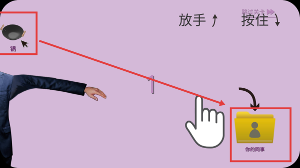 1、在关卡中,按照提示操作(如将“锅”拖向“你的同事”),理解并完成任务目标,熟悉游戏交互方式。