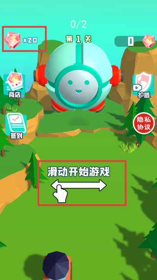 2、进入游戏界面,按照提示“滑动开始游戏”操作,操控角色(如飞行的小球)进行关卡挑战,留意左上角钻石数量,可用于商店购买道具。