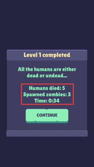 3、完成关卡后,查看结算信息(如Humansdied:5,Spawnedzombies:3,Time:0:34),总结经验,通过点击“CONTINUE”进入下一关。