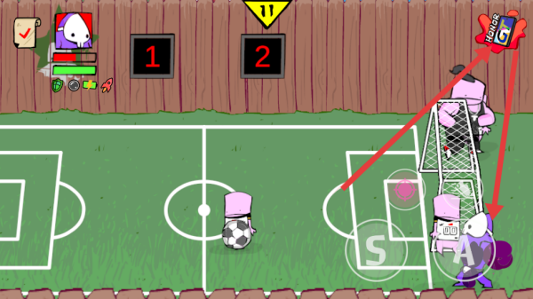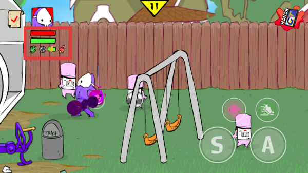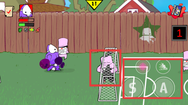 2、熟悉屏幕右下角的操作按钮(如S、A,瞄准、加速按钮),灵活操控角色移动、攻击,应对场景中的敌人(如紫色、粉色角色)。