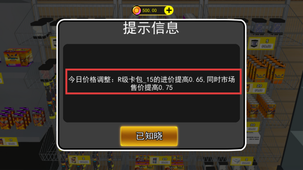 1、游戏开始时,留意提示信息(如“R级卡包_15进价提高0.65,市场售价提高0.75”),了解商品价格变动,合理规划资金。